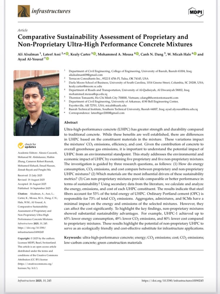 نشر المدرس علي عدنان محمد علي التدريسي في كلية الهندسة جامعة البصرة قسم الهندسة المدنية بحث علمي مشترك مع باحثين من جامعات عالمية في المجلة العالمية Infrastructures وهي ضمن الربع الأول Q1 من مستوعب Scopus بعنوان