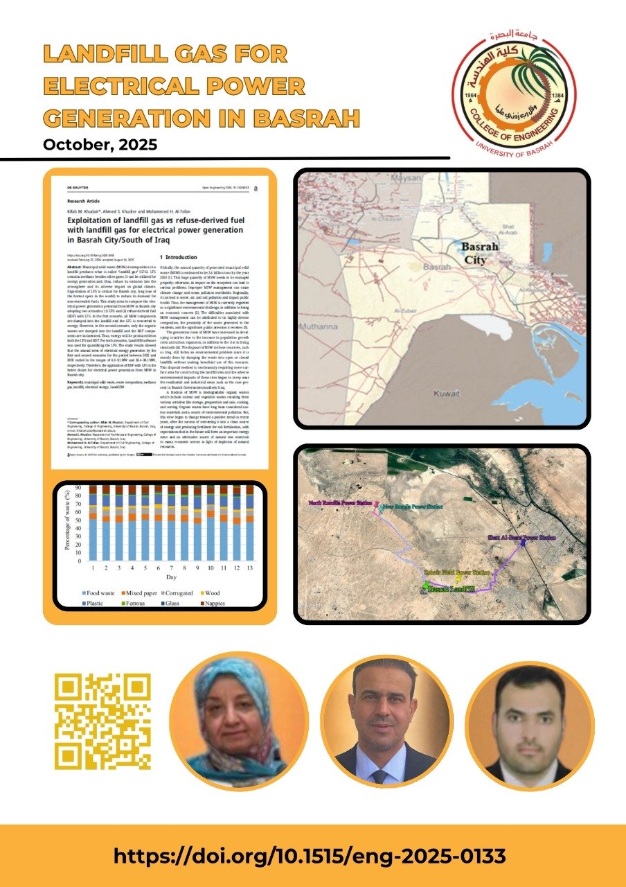 في إنجازٍ علميٍّ مهمٍّ يعكس التقدّم البحثي في جامعة البصرة، تم نشر بحثٍ علميٍّ متميّز لأساتذة من قسم الهندسة المدنية في كلية الهندسة – جامعة البصرة، وهم الدكتورة كفاح محمد خضير والدكتور أحمد صكبان خضير والدكتور محمد حميد سبهان، في مجلة Open Engineering التابعة لدار النشر الألمانية De Gruyter، وهي مجلة عالمية محكّمة ومفهرسة ضمن قاعدة بيانات Scopus وتقع ضمن الربع الثاني (Q2) من تصنيف المجلات العلمية الدولية. تناول البحث الموسوم "Exploitation of landfill gas vs refuse-derived fuel with landfill gas for electrical power generation in Basrah City/South of Iraq" دراسة إمكانية توليد الطاقة الكهربائية النظيفة من النفايات الصلبة في مدينة البصرة، من خلال استغلال غاز المطامر (Landfill Gas) والوقود المشتق من النفايات (Refuse-Derived Fuel – RDF). وقد أظهرت نتائج الدراسة أن تطبيق النظام المزدوج الذي يجمع بين RDF وLFG يمكن أن يحقق إنتاجًا يتراوح بين 26.4 و36.1 ميغاواط سنويًا من الطاقة الكهربائية، مما يُعد خطوة مهمة نحو تعزيز الاعتماد على مصادر الطاقة المستدامة وتقليل الانبعاثات الضارة الناتجة عن حرق الوقود الأحفوري. ويُعد هذا البحث إنجازًا علميًا بارزًا يُضاف إلى سلسلة إنجازات جامعة البصرة في مجال الطاقة المتجددة والإدارة المستدامة للنفايات، ويؤكد على الدور الريادي للجامعة في دعم الأبحاث التطبيقية التي تسهم في خدمة المجتمع العراقي وتحقيق التنمية البيئية المستدامة. للاطلاع على البحث، يمكن زيارة الرابط الآتي: https://doi.org/10.1515/eng-2025-0133