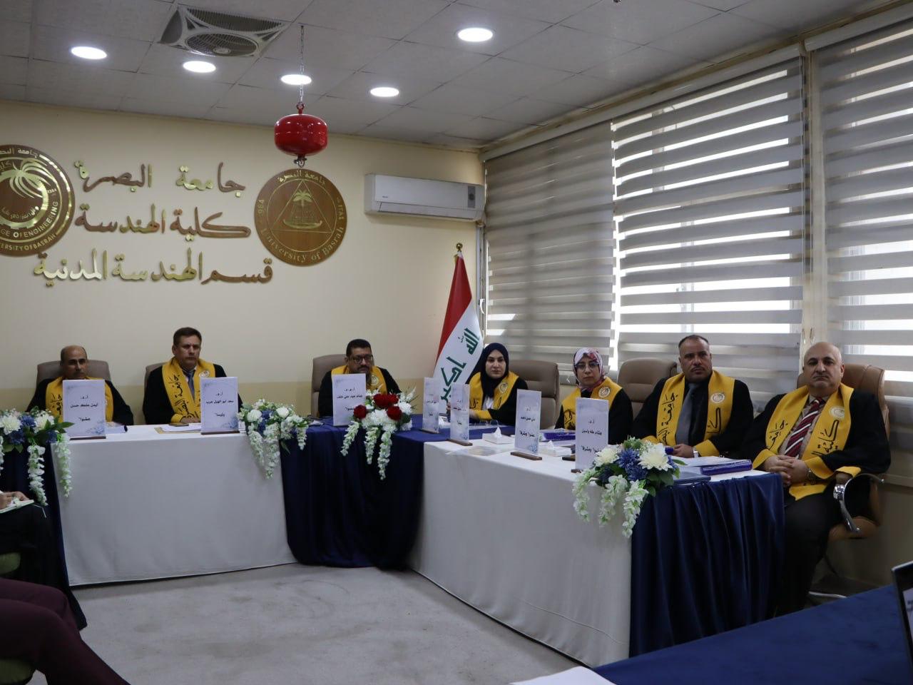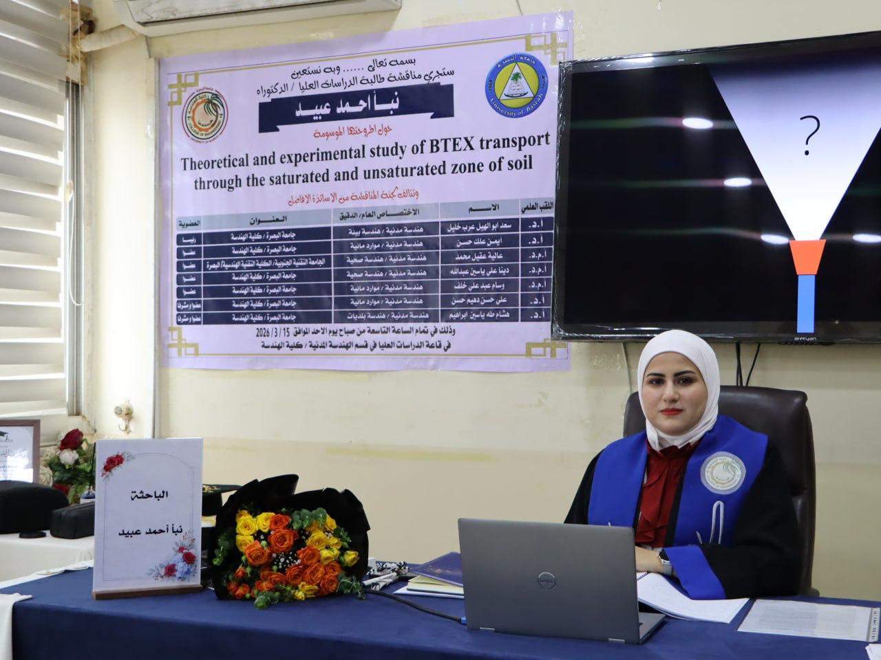 نوقشت اطروحة الدكتوراه للباحثة نبأ احمد عبيد في كلية الهندسة جامعة البصرة قسم الهندسة المدنية وتحت اشراف الاستاذ الدكتور هشام طه ياسين والاستاذ الدكتور علي حسن دهيم بعنوان دراسة نظرية ومختبرية لأنتقال BTEXعبر المنطقة المشبعة وغير المشبعة من التربة