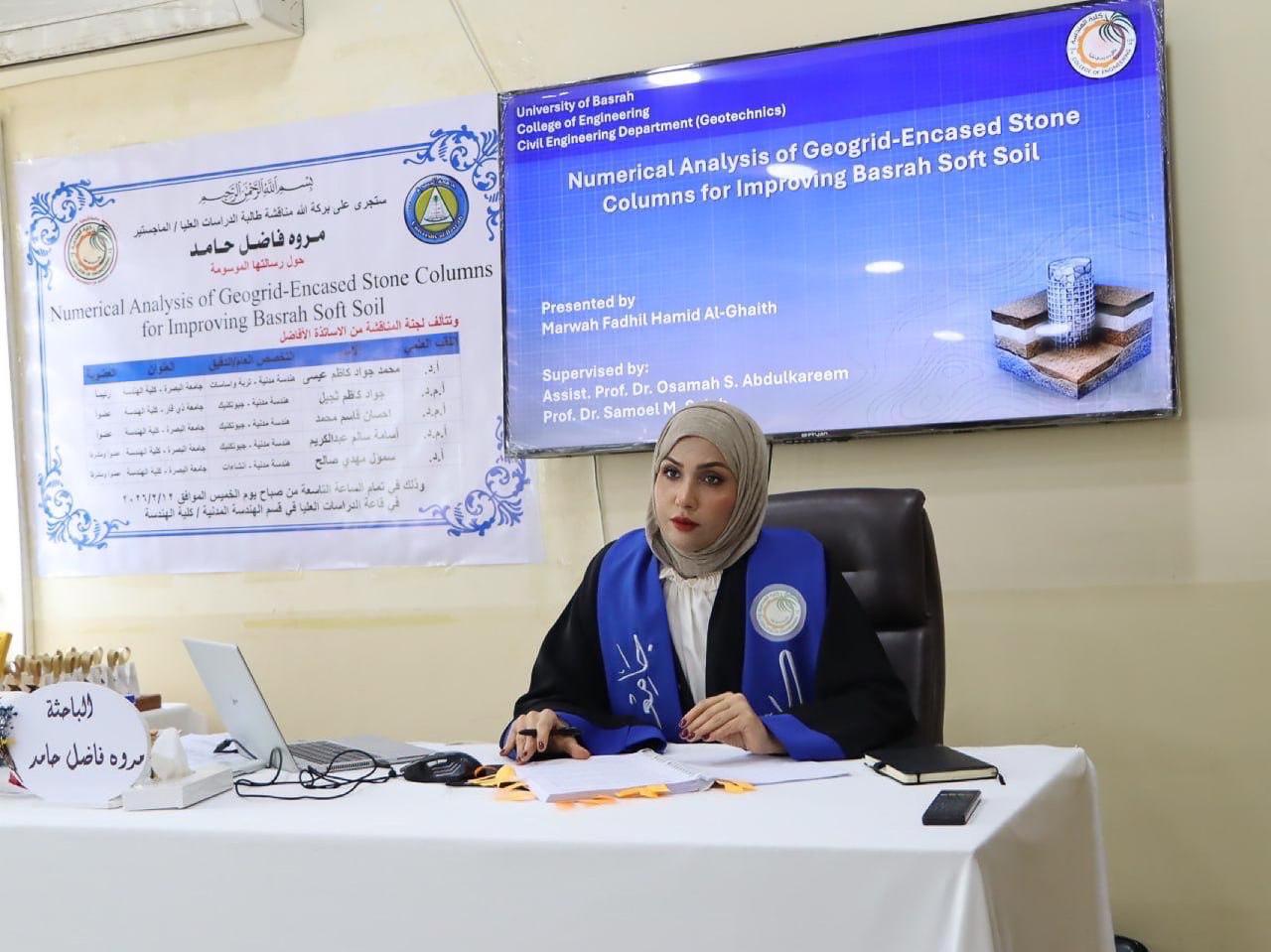 نوقشت رسالة الماجستير للباحثة مروة فاضل حامد وتحت اشراف الاستاذ الدكتور سمؤل مهدي صالح و الاستاذ المساعد الدكتور اسامة سالم عبد الكريم في كلية الهندسة جامعة البصرة قسم الهندسة المدنية بعنوان التحليل العددي للأعمدة الحجرية المغلفة بالمشبكات الجيوتقنية لتحسين التربة الرخوة في البصرة وتتضمن