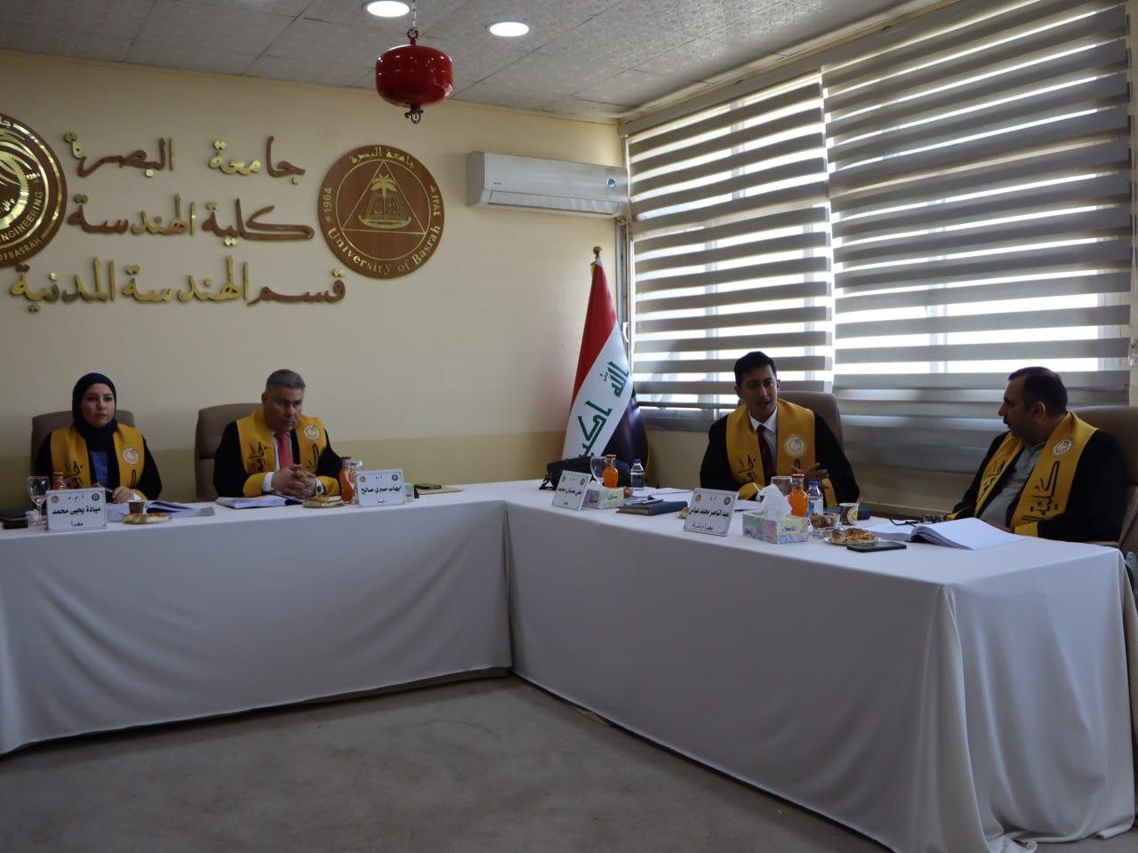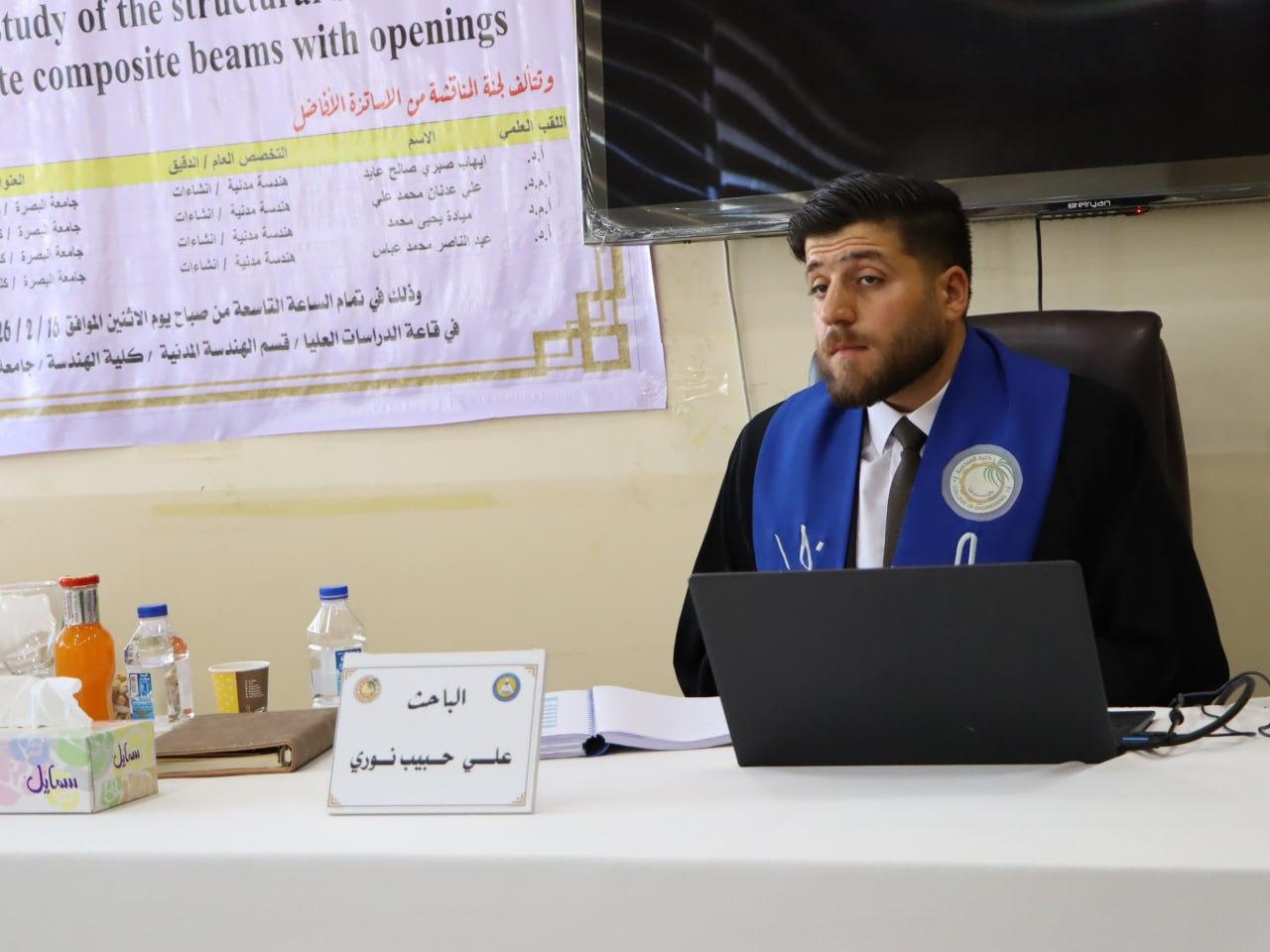 نوقشت رسالة الماجستير للباحث علي حبيب نوري في كلية الهندسة جامعة البصرة قسم الهندسة المدنية وتحت اشراف الاستاذ الدكتور عبد الناصر محمد عباس بعنوان دراسة نظرية للسلوك الانشائي للعتبات المركبة من الحديد والخرسانة مع وجود الفتحات في العارضة .