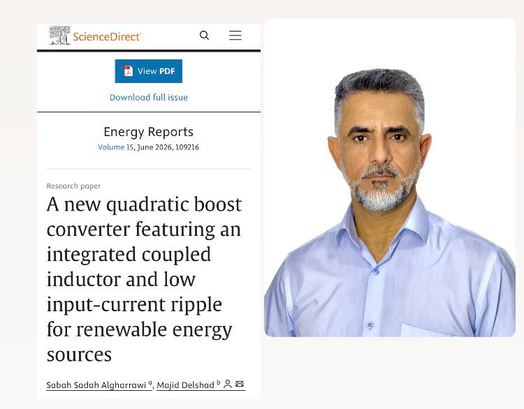 نشر المدرس المساعد صباح سادة الغراوي التدريسي في كلية الهندسة جامعة البصرة قسم الهندسة الكهربائية بحث علمي في مجلة Energy Reports التابعة لدار النشر Elsevier، وهي مجلة محكمة ومفهرسة ضمن قاعدة بيانات