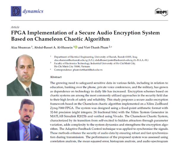 نشر ( الدكتور عبد الباسط عبد الصمد الحسين و المدرس المساعد علاء شمران عبد ) التدريسيان في قسم الهندسة الكهربائية/ كلية الهندسة بجامعة البصرة وبالتعاون مع باحث من كلية تكنولوجيا الإلكترونيات، الجامعة الصناعية الفيتنامية، بحثا علميا مشتركا في المجلة السويسرية"Dynamics" والتي تعتبر من المجلات العلمية الرصينة الصادرة عن دار النشر العالمية MDPI والمصنفة ضمن مستوعبات: